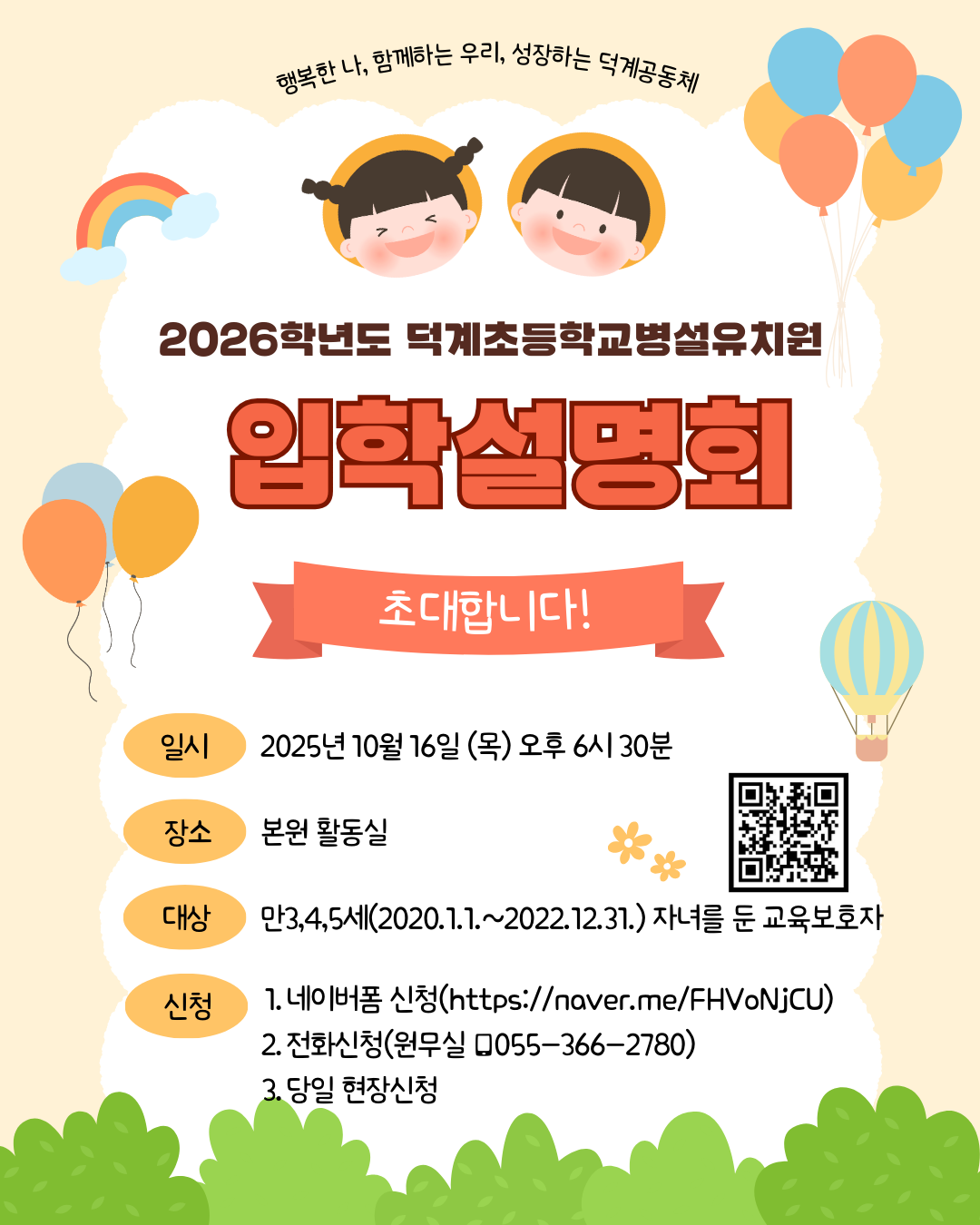 사랑이 가득한 덕계초등학교병설유치원에서 입학설명회를 실시합니다.관심있는 교육보호자님들의 많은 참석 부탁드립니다. 감사합니다^^